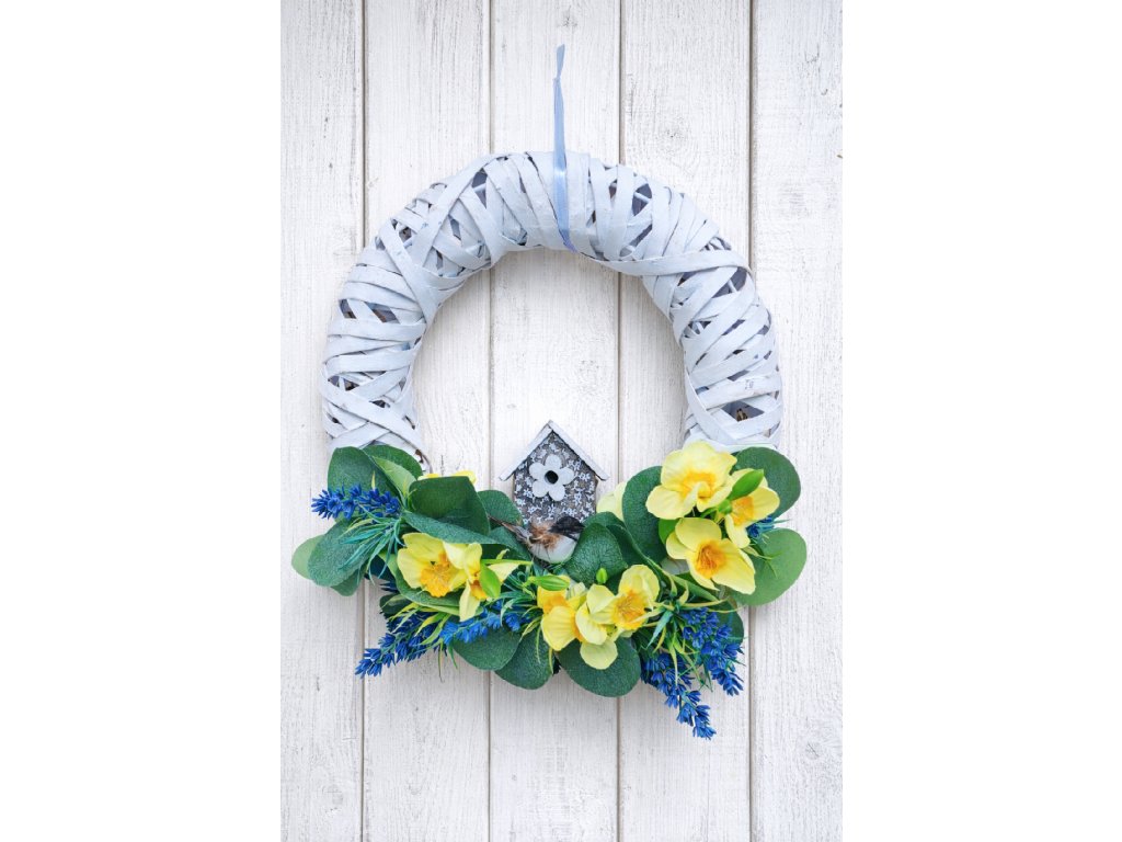 Jarní věnec na dveře s narcisy, domečkem a ptáčkem