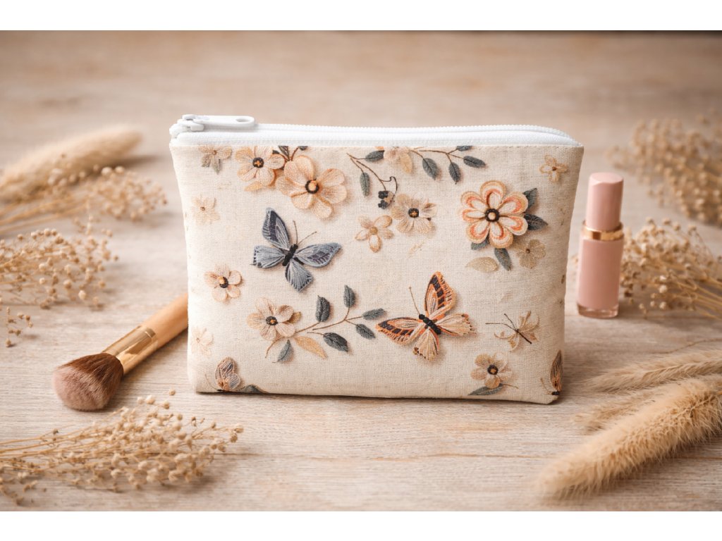 Jemná a elegantní kosmetická taštička s romantickým motivem květin a motýlů vnese do každodenní péče o krásu kousek přírody. Díky neutrálním béžovým tónům působí nadčasově a snadno se kombinuje s dalšími doplňky.