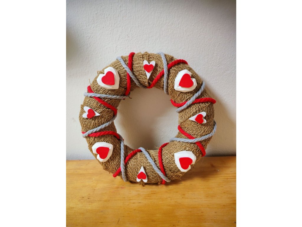 Jutový věnec na dveře se srdíčky – přírodní dekorace plná něžnosti